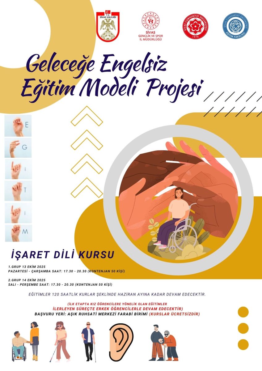 Geleceğe Engelsiz Eğitim Modeli Projesi kapsamında İŞARET DİLİ KURSU 13 Ekim 2025 tarihinde başlayacaktır. Eğitimler ilk etapta kız öğrencilere yönelik olarak verilecektir. İlerleyen süreçlerde erkek öğrenciler için de eğitim kursları açılacaktır. Eğitimler kurlar şeklinde Haziran ayına kadar devam edecektir. Her kur toplam 120 saat olacaktır. Başlangıçta iki grup halinde toplam 100 kız öğrenciye eğitim verilecektir. Eğitimlere başvurmak isteyen öğrencilerimiz KYK Kız Yurdunda bulunan Aşık Ruhsati Merkezi Farabi Birimine müraacat edebilir.